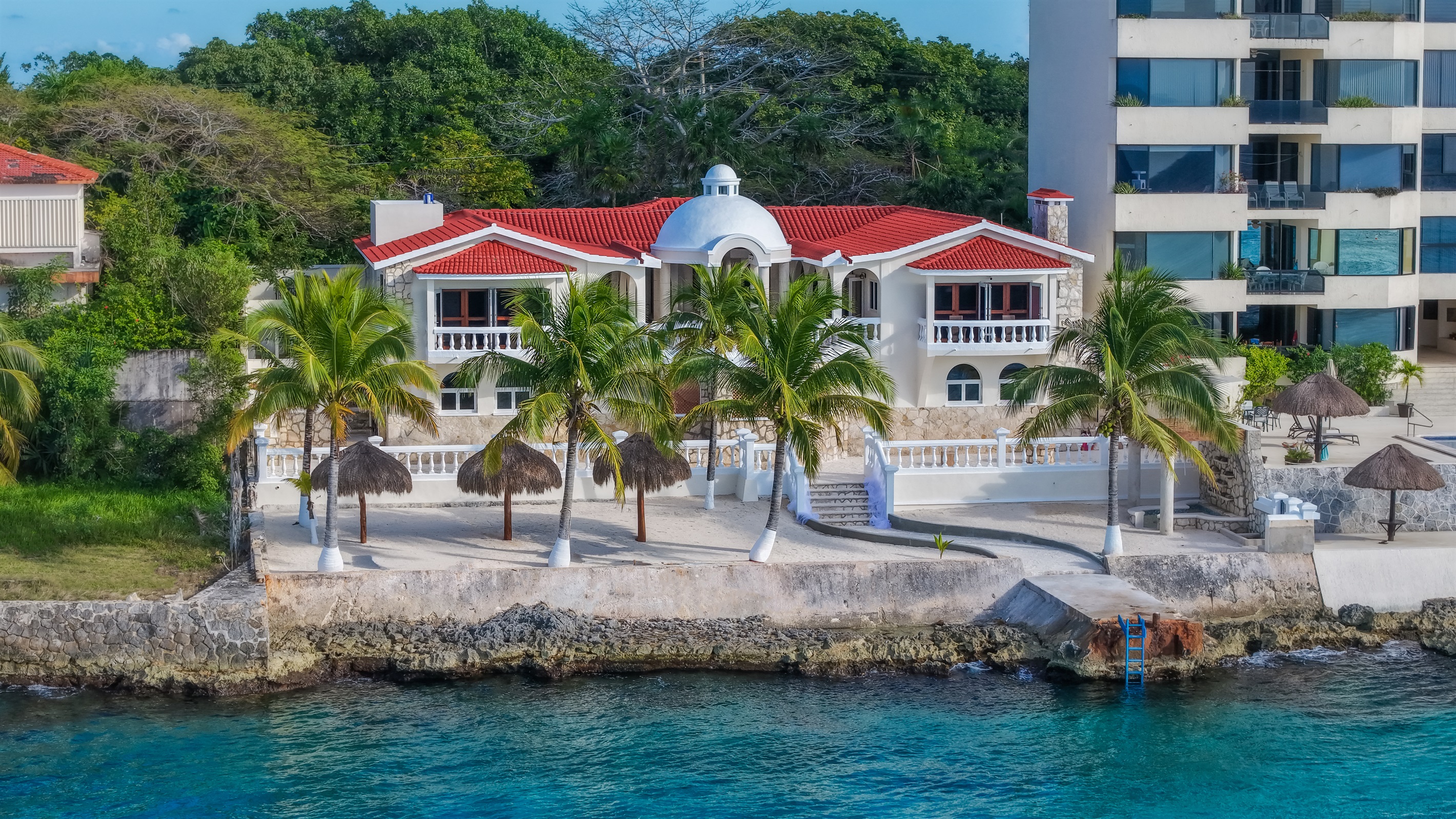 Discover Coconut Villa (formerly Villa Loyd), a modern three-story oasis nestled on the ocean's edge in Cozumel. Enjoy unparalleled snorkeling opportunities amid rocky coral formations just steps away. Inside, find a fully equipped kitchen, dining, and living areas with ocean views. With three bedrooms, including a master suite with a private terrace, and a lower-level entertainment area, relaxation awaits. Explore the backyard with loungers and ocean access for a refreshing dip.