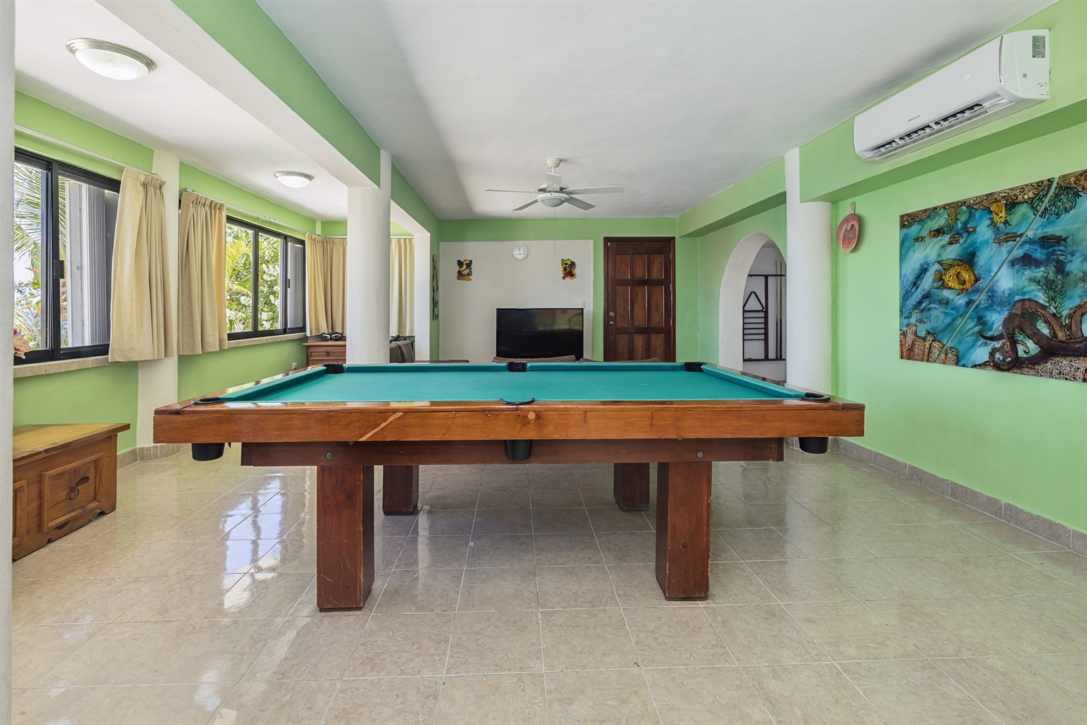 Entering from the street, you'll step into the expansive second level, greeted by generous living spaces. This area encompasses comfortable couches, cable TV, a full-size pool table, a dining room with seating for eight, a well-equipped kitchen, and a convenient desk area for catching up on emails.